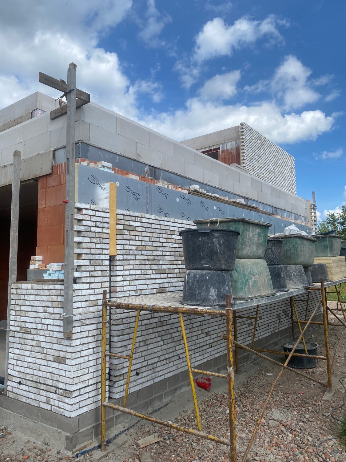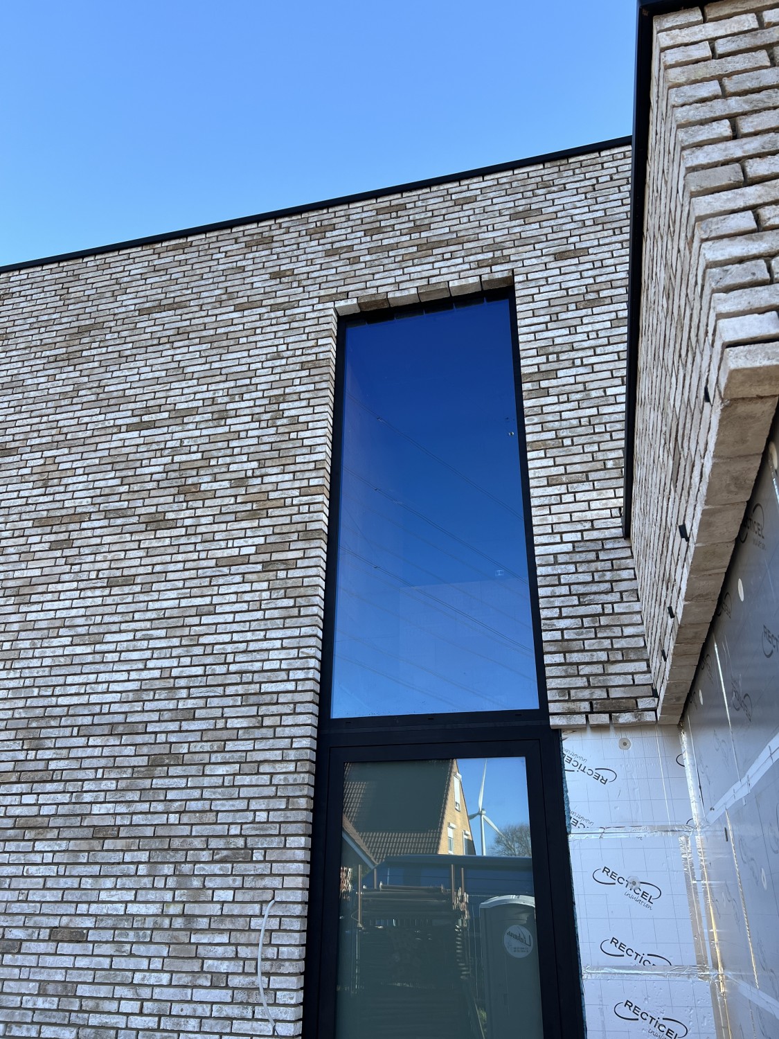 Deze ruime open villa, uitgevoerd in machinale handvormbaksteen, is een schitterend voorbeeld van moderne architectuur. De gevel is gedomineerd door zachte witte, beige en grijze tinten, met subtiele groene sintering, wat de woning een elegante en zachte uitstraling geeft. De zwarte aluminium ramen en de geprofileerde aluminium gevelbekleding met ingewerkte garagepoort, voegen een strak en eigentijds accent toe.